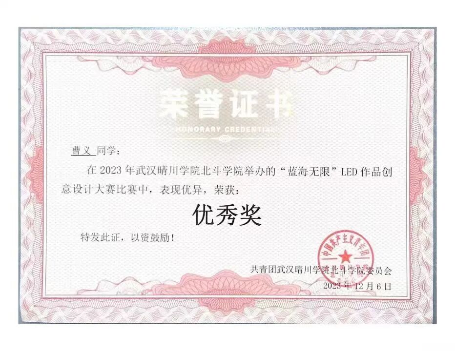 曹义深知,扎实的专业能力离不开实践的锤炼。为此,他主动投身各类学科竞赛与科研项目,在实践中淬炼真知、追求卓越。在国家级竞赛中,他参加了“西门子杯”中国智能制造挑战赛全国初赛,带领团队攻克了嵌入式系统设计、通讯协议开发等重重难点,最终获得了三等奖。在省级赛事中,他屡创佳绩,拿下了湖北省翻译大赛一等奖、“挑战杯”科技作品大赛省三等奖、全国大学生电子设计大赛省三等奖等。在校级层面,他也表现出色,获得“森木磊石杯”电子设计竞赛一等奖、“蓝海无限”LED 创意设计大赛二等奖。他还参与了《育苗无忧——智能培控引领乡村致富路》项目,该项目荣获中国国际大学生创新大赛校级金奖,两次获得省“挑战杯”铜奖。