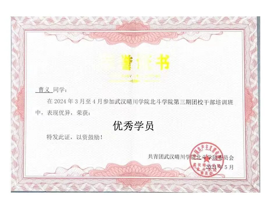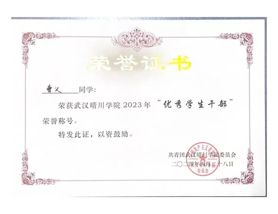 曹义不仅精于学业、专于实践,更以高度的责任感投身学生工作,在不同岗位上锤炼综合能力,践行全面发展的理念。