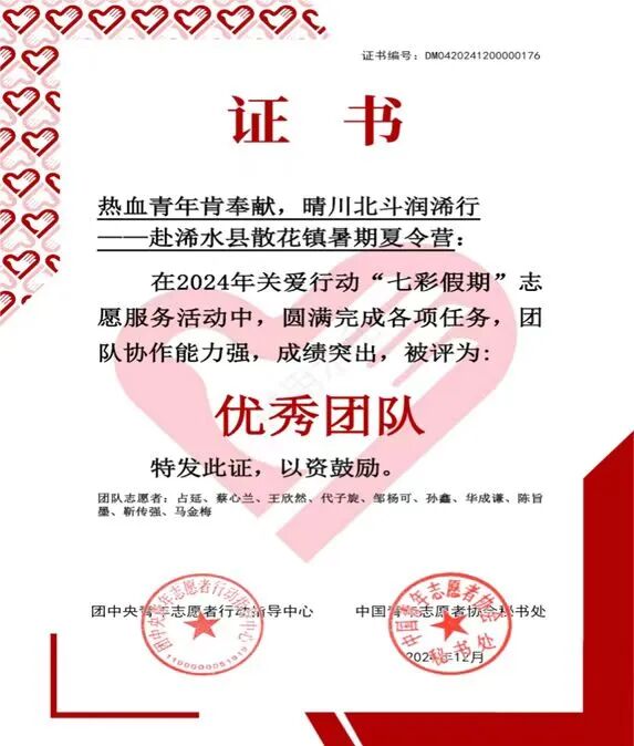 2024年暑期,她作为武汉晴川学院北斗学院“热血青年肯奉献,晴川北斗润浠行”支教团成员,赴浠水县散花镇开展乡村支教,为当地儿童提供学业辅导、法治教育与兴趣课程。该团队因表现优异,获评团中央“优秀团队”称号,相关事迹被湖北日报、极目新闻、中青校园网等媒体报道86次。