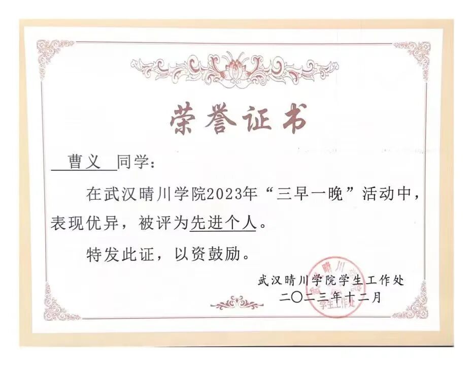 以梦为马,不负韶华。两人虽各有侧重,却都像两颗明亮的星,在武汉晴川学院的天空下,以坚定的理想信念为指引,朝着目标稳稳前行。他们把勤勉钻研当作日常姿态,凭借着这份坚持,他们收获了丰硕卓越的成果,把个人的理想和民族复兴的伟大征程紧紧联系在一起。在未来的日子里,用炽热的青春汗水,去浇灌出属于这个时代,也属于自己的绚丽之花,让青春在为国家、为社会的贡献中绽放出最耀眼的光芒。
